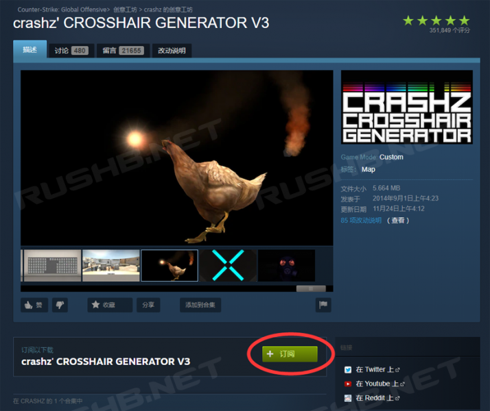 选择想要订阅的地图,本文以准心修改地图CROSSHAIR GENERATOR V3为例,在地图详情页,点击“订阅”绿色按钮,CSGO客户端便会自动下载地图文件。