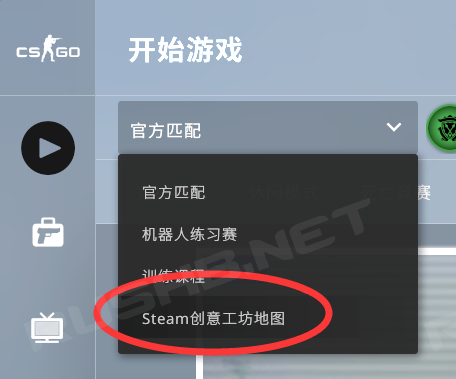 打开CSGO国服客户端,在“开始游戏”中的下拉框里,多出了“Steam创意工坊地图”,点击后便能看到订阅的地图,若地图未下载完成请等待。