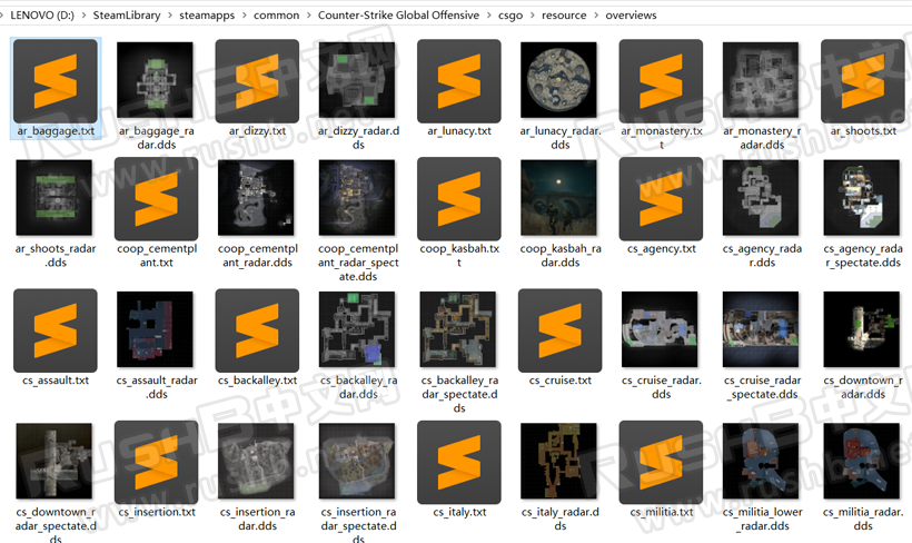 在这个文件夹中,包含了CSGO目前所有小地图雷达文件,包括一些已经移除的老地图,雷达文件为dds格式,可能需要专门软件才可能打开,比如装了插件的Photoshop,也可以通过网上的dds转图片工具转换再使用。
