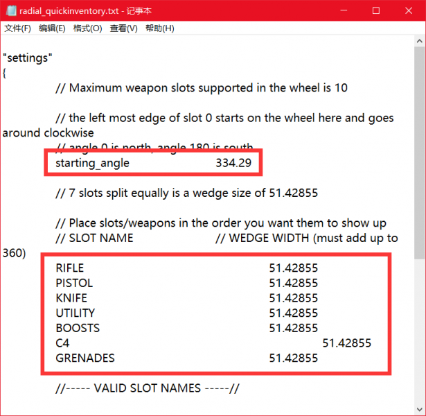 打开其中的“radial_quickinventory.txt”,如图,我们只要修改红框内的参数,//后的文本为注释,意思分别为