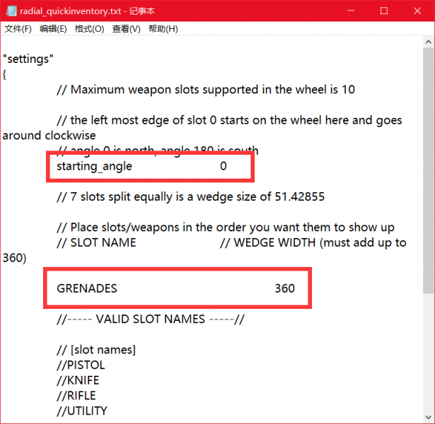 按照我的需求只显示投掷物,则只需要把其他装备槽参数名删掉,并把“GRENADES”(投掷物)的角度改为360,即铺满整个轮盘。另外个人需求把起始角度改为从0度开始,改动后的参数如图: