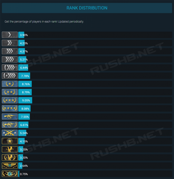 CSGO STATS网站会定时更新CSGO段位分布图表,如果需要,可以前往查询最新数据: