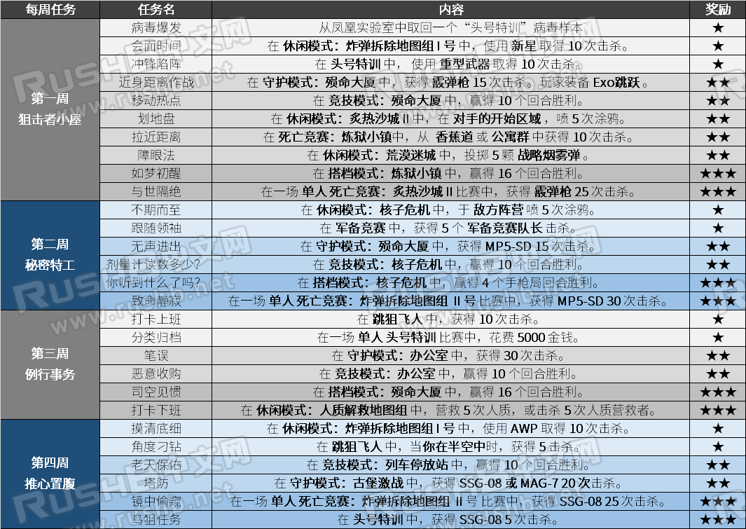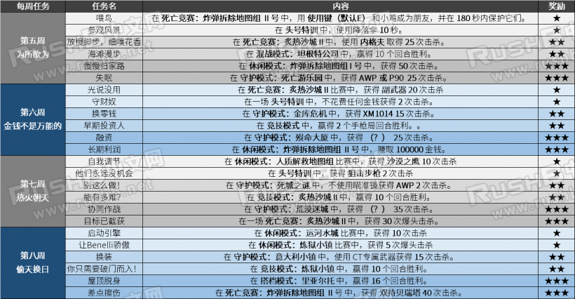 本文整理了进行中的CSGO第九个大行动:裂网大行动每周任务详细清单,包括后续未开始得任务(只要游戏文件能找到的话),清单列表包括任务名、任务内容(模式、地图、武器击杀等达成条件及可以拿到得大行动之星)。