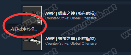 而在游戏外,比如社区市场的皮肤,可以将鼠标移动到图片上显示三角按钮点击“在游戏中检视”进入客户端查看。
