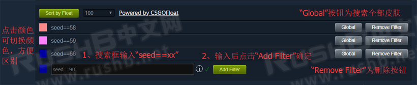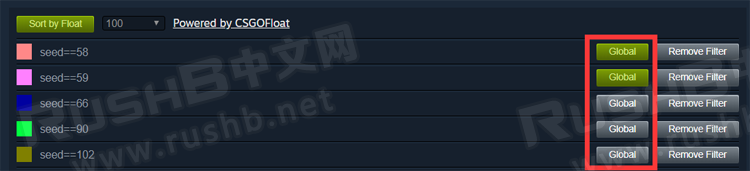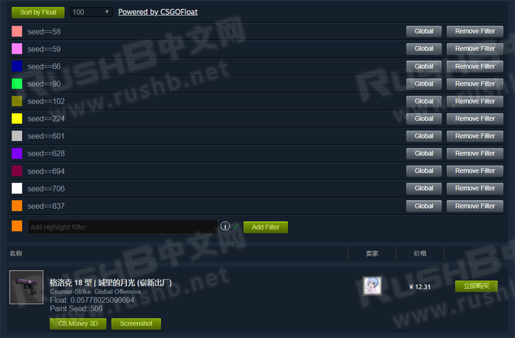 上面已经提高月光Glock18有星星的图案模板编号为:58、59、66、90、102、224、601、628、694、706、837等,我们则在输入框内输入“seed==编号”,然后点击“Add Filter”确定,如图: