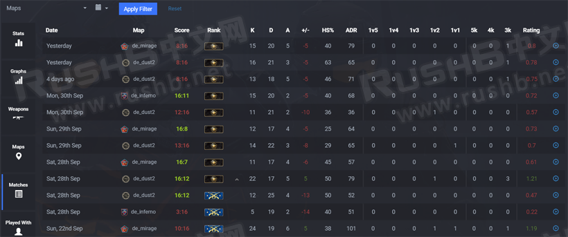 注意:如果是刚刚打完的比赛并不会马上显示在CS:GO Stats网站上,因为需要将Demo下载到CS:GO Stats服务器上进行分析,快的话2个小时,慢的话可能要半天。
