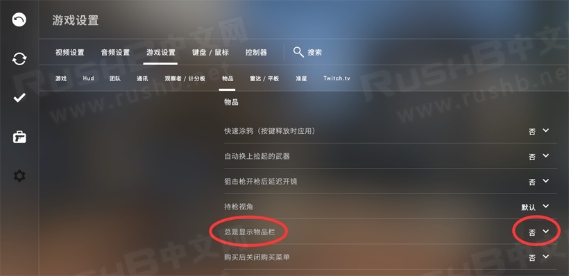 当然,如果你想总是显示物品栏,游戏设置里更改即可,将“否”改为“是”,如图。