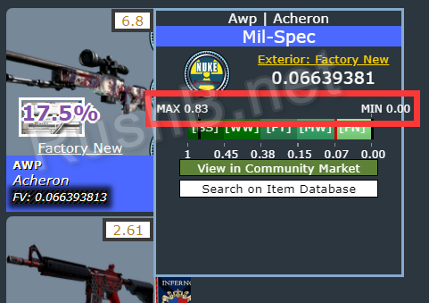 以我上图10把原材料为例,平均磨损值为0.07996,合出的结果有多种,其中AWP | 冥界之河的最高磨损值为0.83,最小磨损值为0,那么如果能合出这把AWP,则磨损度为0.0663