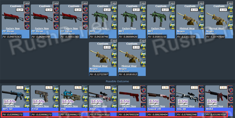 通过上面提供的汰换合同模拟器,输入原材料的磨损,我们可以直接得出各个结果的磨损值。如你所见,除了SSG08是略磨,其他结果均为崭新,所以我们不一定要买10把崭新皮肤,也有概率合出崭新。