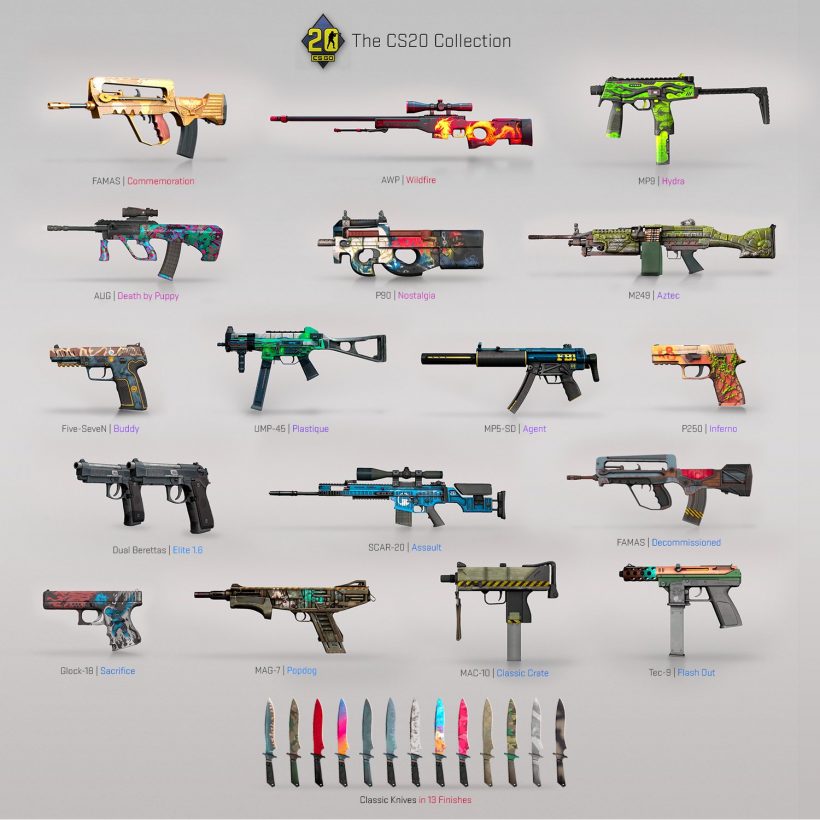 今天,我们发布了CS20武器箱,以庆祝《反恐精英》20周年。该武器箱包含了Steam创意工坊各种主题皮肤,并以经典海豹短刀作为特色物品。另外你还可以购买到CS20贴纸胶囊,包含20个社区设计的贴纸。