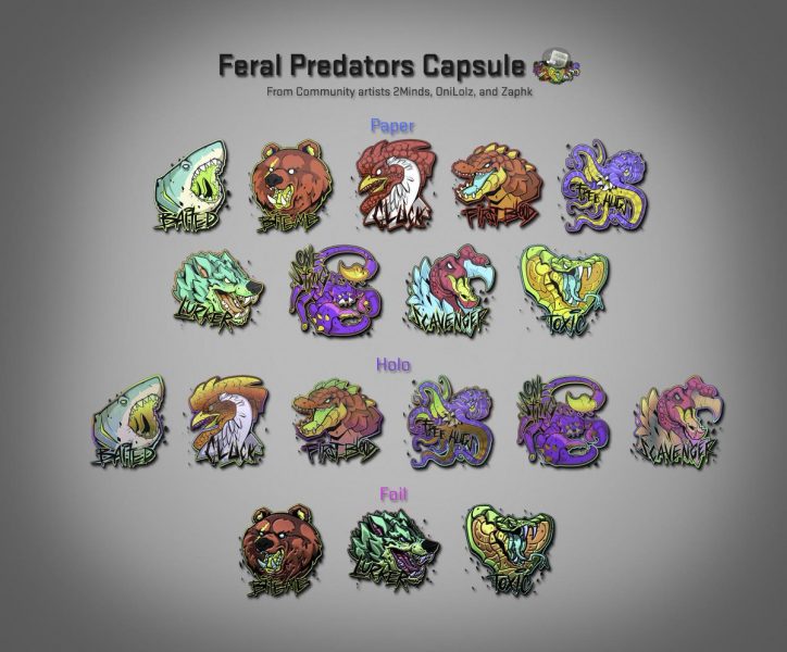 我们还推出社区艺术家2Minds、OniLolz和Zaphk一起制作的Feral Predators(野性掠夺者)贴纸胶囊,包含9种设计18张贴纸。