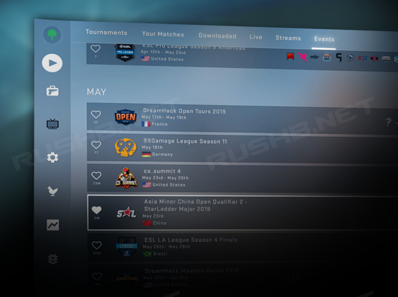 玩家可以在观战功能赛事栏查看由HLTV提供的专业线下比赛列表,点击关注,一旦比赛开始,便可在CSGO主菜单获得通知。