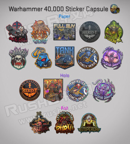 今天我们发布了战锤40K印花胶囊,包含战锤40K主题的17张专属贴纸,从Full Buy普通贴纸到混沌星际战士闪亮贴纸,收集它们应用到你的武器上。