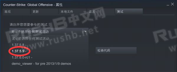 在CSGO属性窗口中,点击“测试”栏,在“请选择您想要参与的测试:”下拉框选择“1.37.5.9”