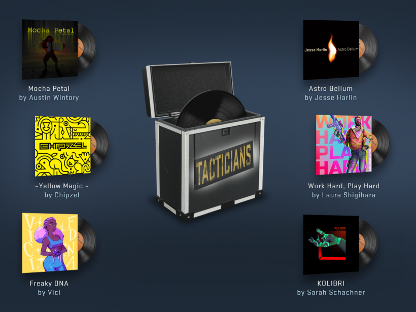 今天我们推出了Tacticians音乐盒集,包含来自Austin Wintory、Chipzel、Jesse Harlin、Laura Shigihara、Leonard Paul(Freaky DNA)和 Sarah Schachner所创作的6款音乐盒。没有比和游戏中的玩家分享你的新MVP音乐更好的事了。