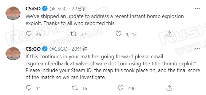 首先,CSGO官推说明了修复近期再次出现的C4秒炸漏洞,感谢反馈此漏洞的玩家。如果你在之后的比赛仍遇到C4秒炸,请发送标题为“bomb exploit”的邮件至CSGOTeamFeedback@valvesoftware.com,内容请提供你的Steam ID、发生此事的地图以及比赛的最终比分,以便CSGO官方调查。