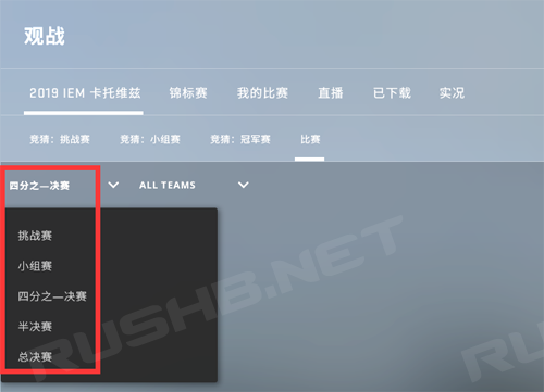 然后会进入观战界面的“比赛”栏,选择要兑换的比赛,点击左边的下拉框可以其他选择赛事阶段的比赛。