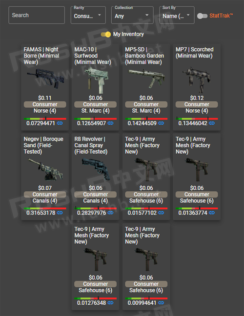 这里以我库存的消费级皮肤为例,包含多个收藏品,每件皮肤都显示了磨损值。