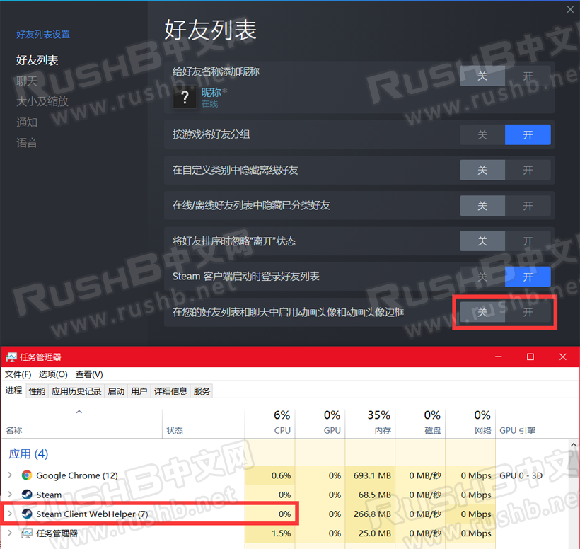 将“在您的好友列表和聊天中启用动画头像和动画头像边框”功能点击关闭,可以看到占用性能很快下降,这样玩CSGO等游戏就不会卡了。