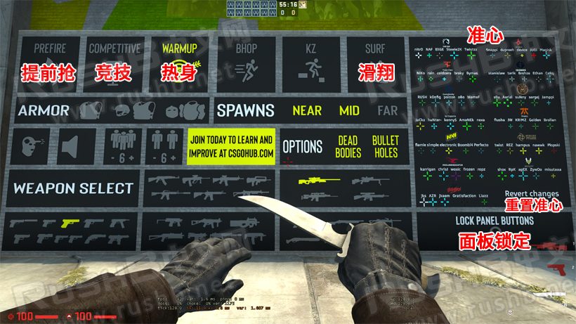 地图默认进入热身模式(WARMUP),玩家附近会有一个功能面板,如图: