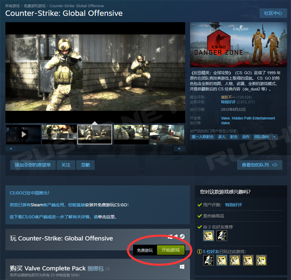 在CSGO游戏详情页,我们可以看到CSGO免费游玩按钮,点击“开始游戏”绿色按钮下载游戏。