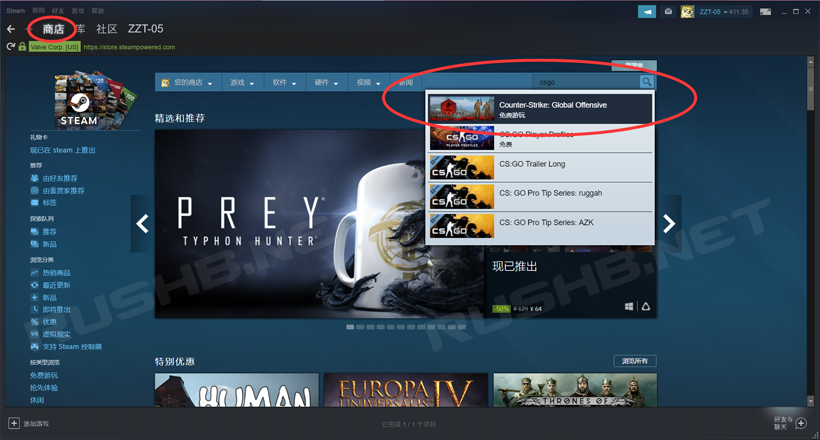 Steam客户端安装完成后并登录注册好的Steam帐户,进入Steam商店首页,在右上角的搜索框输入“csgo”,便会显示反恐精英:全球攻势游戏,点击进入CSGO游戏详情页。