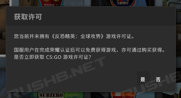 您当前并未拥有《反恐精英:全球攻势》游戏许可证。国服用户在完成荣耀认证后可以免费获得游戏,亦可通过购买获得。是否立即获取CS:GO游戏许可证?
