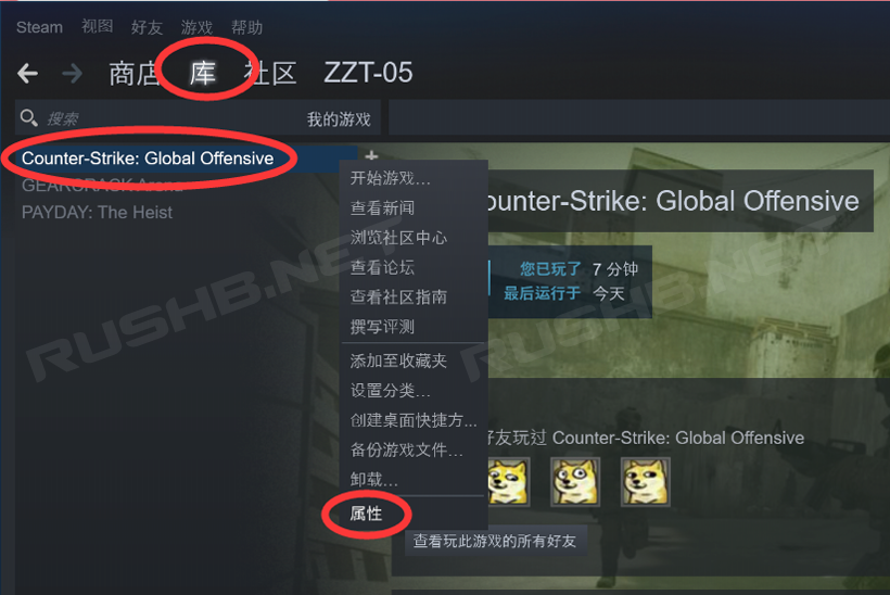 不用理会提示,点击“否”取消并退出游戏,返回Steam客户端,进入游戏“库”,找到CSGO,“右键”并点击“属性”。