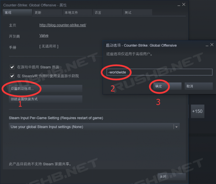 在属性窗口内点击“设置启动选项”,然后再新启动选项窗口内输入国际服启动项“-worldwide”,然后点击确定。