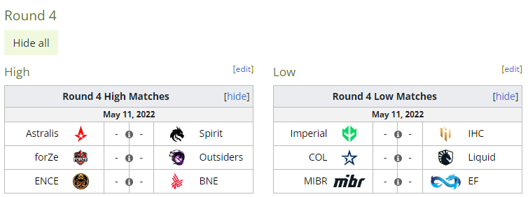 其中,Astralis vs Spirit、forZe vs Outsiders和ENCE vs Bad News Eagles这三场比赛胜者将晋级,败者将进入第五轮;Imperial vs IHC、Complexity vs Liquid Liquid和MIBR vs Eternal Fire这三场比赛败者将淘汰,胜者进入第五轮继续打。