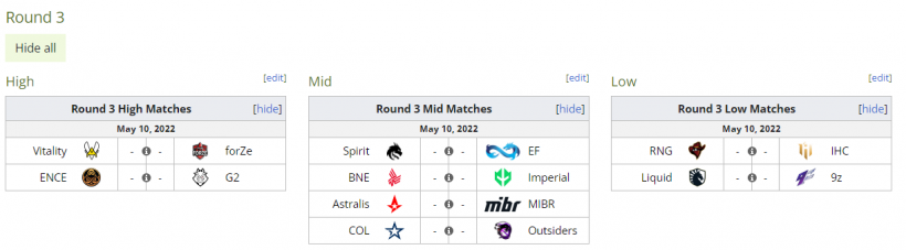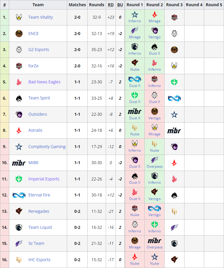 另外,今晚将决定玩家战队预测的3-0和0-3选项,Vitality vs forZe和ENCE vs G2这两场比赛为BO3,胜者将已3-0战绩晋级,RNG vs IHC和Liquid vs 9z这两场比赛也是BO3,败者将以0-3战绩淘汰。