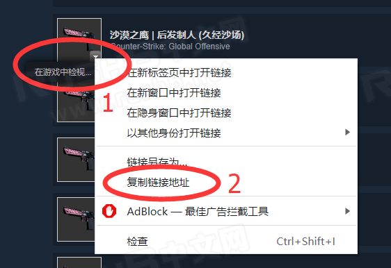 首先,我们用浏览器打开Steam社区市场或者是库存界面,然后找到要检视的皮肤,右键点击“在游戏中检视”按钮,然后点击“复制链接地址”,如图: