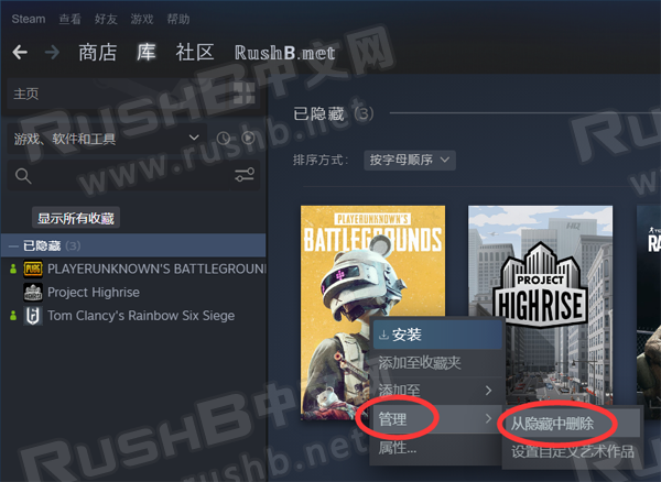 然后隐藏游戏界面会显示你所有已隐藏的游戏,如果想要还原显示,只要在游戏右键——“管理”——“从隐藏中删除”,那么游戏便取消隐藏,在游戏库正常显示。